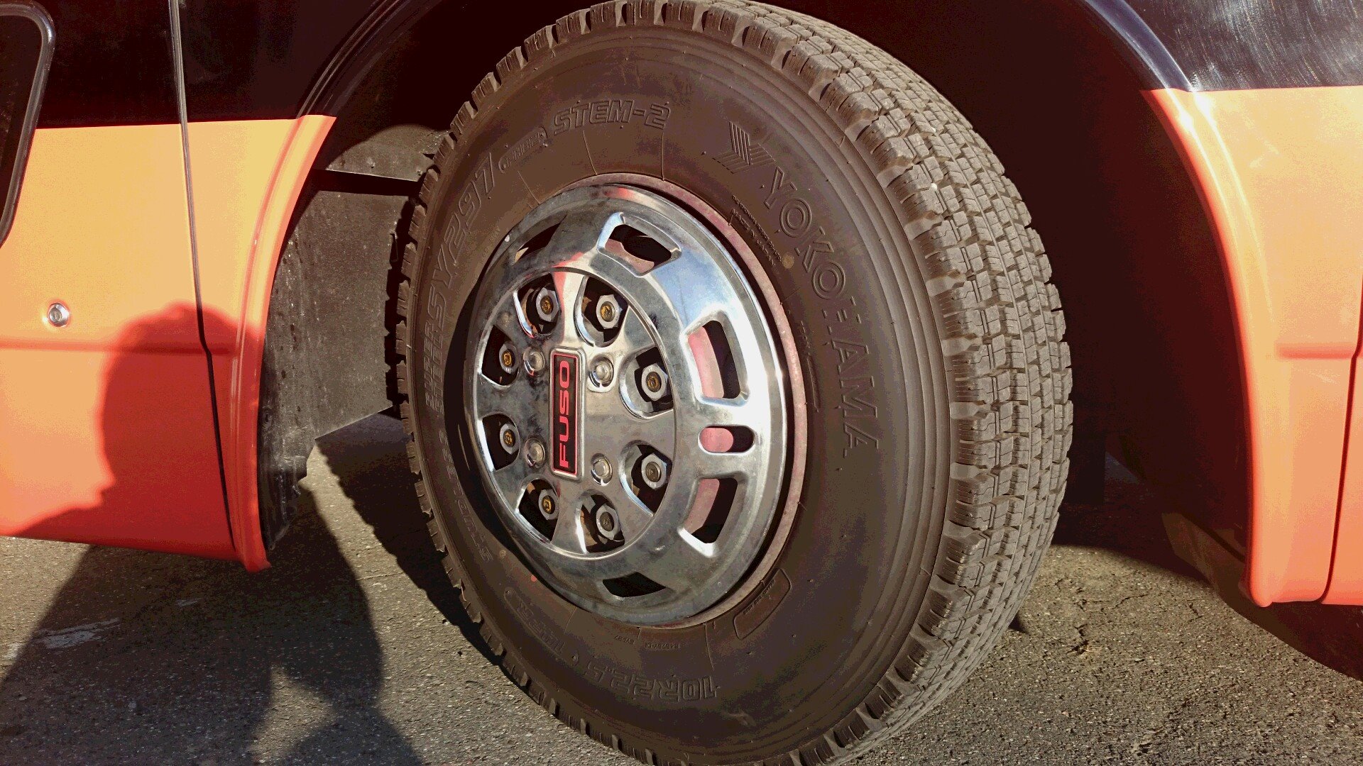 ちなみにバスのタイヤは22.5インチあり、普通乗用車が16-17インチ程度ですので、1.3倍くらいあるのです!